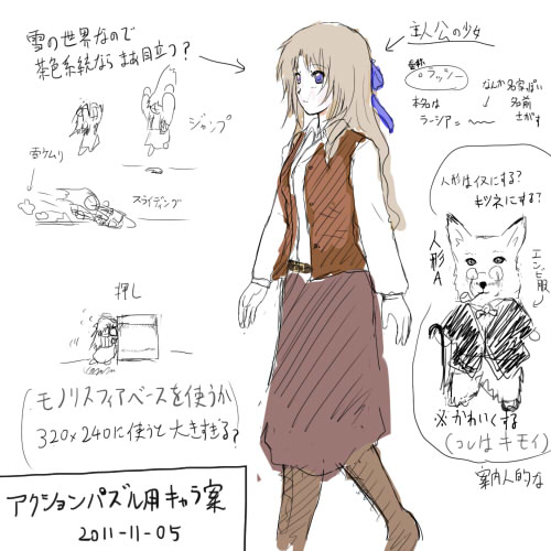 ・カウントタイムターンシステム調整 ・キャラクターのパラメータを実装した ・攻撃が可能になった(スキル処理の基礎部分作成) ・敵のAIを実装した。範囲内に入ると反応して追ってくるタイプ。 ・画面サイズは640x480に決定 ・合成器で暫定主人公画像Cを作った、ちょっとお気に入り → 詩人とかそんな感じのキャラになりそうです。 主人公の画像(タイプ)は、スタート時に選択可能です。 |