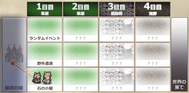 移動したら昼のイベントとして、着いたエリアに指定されているイベントをこなします。
