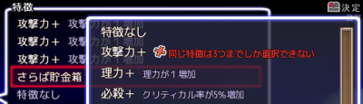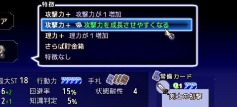 『片道勇者2』では攻撃力や回避率+などの「特徴」を「重ねて取った」ときの効果を、