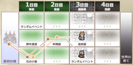 ということで、早速 『片道勇者TRPG』 についてご紹介です! 【まず「TRPG」って何?】 一言で言うなら「ルール付きのごっこ遊び」です! 「GMという司会者」と「数人のプレイヤー」が集まり、プレイヤーは GMの出した試練に対してキャラクターの行動を演じつつ、ゲームを進めていきます。 たまに「3mの穴を幅跳びで飛び越えられたか?」といった、成功したか失敗したか 判断が付きづらい行動があるので、そういう場合はサイコロの出目で成否を決定します。 そこの「判定」でワーキャー言うのが楽しいゲームです。 なおコンピュータゲームと違い、キャラクターのデータは自己管理です。 【『片道勇者TRPG』 はどんなゲーム?】 まず一番大きな点を述べると、『片道勇者TRPG』は 縦3列×横一定日数のエリアを右に進行しながら冒険していくゲームです。 <ゲームの進行図 これは4日の旅> ※以下の状況なら、2日目までの地形はすでに闇に呑まれたことになっています ![]() マップは、1日目以外は未知なので、「偵察」したり、 実際に行ってみないと何が起きるか分かりません。 各プレイヤーは、分かれて進むことも可能です。 「魔王を倒す」か、「世界の果てにたどりつく」と一周が終了します。 ……が、実はゲームの主目的はその2つではありません! 【ゲームの主目的】 ゲームの目的は、各PCに与えられた秘密の「クエスト」をこなしていくこと! 「え、魔王倒すことじゃないの?」と思われるかもしれませんが、 真の目的は「クエスト」のほうにあります! もちろん、クエストクリアの条件として「世界の果てにたどりついた」や 「魔王を倒した」といったものも作れますので、 GMさんが正当派なゴールを設定することも普通にできます。 ただ、魔王撃破などが常に「主」ではないよ、ということですね。 ルールブックに書いてあるデフォルトクエストだと、 プレイ内で「魔王とは別の試練が新たに発生するクエスト」や、 「旅を楽にするクエスト」「逆に難しくするクエスト」などがあります。 一例としては、「すごく強い敵と戦って強力な『特徴』を解放する」といったクエストですね。 この場合、「魔王を倒す」のはオマケになります。 また「クエスト」には、攻略していくと次の段階のクエストがオープンされて、 物語が進んでいくものがあります。そうやって連続クエストを積み重ねていくプレイを、 「キャンペーンシナリオ」といって、続き物のお話として表現されます。 基本的には、「キャンペーンの最後のクエスト」で大ボスと戦う感じになるでしょう。 クエスト進行は1プレイ(=勇者の1人生)あたりだいたい1回分なので、 基本的には何度も転生しながらストーリーを進めていくことになります。 ゲームが終わると【伝説P】がもらえて、新たな特徴を解放できたり、 次元倉庫を拡張できたりします。この辺りの流れも実に原作再現! 【1日のアクションについて】 上に掲載したマップは4日の旅をあらわしたものですが、 さらに1日の間に何が起きるかが分かれば、 このゲームの全体の流れをおおまかに掴めたといっていいでしょう。 1日の間に発生するイベントは、以下の流れとなっています。 ●昼イベント(強制): マスに設定されたイベントが実行される。強制。 店に出会ったり、ダンジョン探索したり、山賊に襲われたりする。 ↓ ●魔王遭遇(強制): 2、4、6日目の昼イベント後のみ発生。魔王が出てくる。 ↓ ●夜イベント(自由): いわば自由行動。偵察したり仲間と交流したりできる。 ↓ そして次の日へ……。 各イベントでは、「能力値+2D6(サイコロ2個を振った合計)」の結果で 物事がうまくいったかどうかを判定します。 能力値はおなじみの「筋力・敏捷・生命・知力・意志・魅力」の6種類! 使う能力はその都度、GMに指示されます。 同じマスに味方がいれば、「協力」して能力値を足すこともできます。 (※ 最大で、互いの【好意】=仲良し度の分まで) 他にも「ジャッジ」と呼ばれるシステムがあり、ロールプレイや演出をすることで 判定に+1のボーナスをもらえる処理が明文化されています。 このあたりも昔ながらのTRPGの「PCの演出による補正」を うまいことシステム化した感じで面白い部分です! 「でもロールプレイなんていきなりできないよ!」という人も安心! 何も思いつかなければ、演出をやらずにそのままサイコロを 振ればいいだけなので、初心者の人も安心です。 【シンプルでアツい戦闘!】 『片道勇者TRPG』では、通常戦闘は1回の攻撃で終了します! シンプル! すばやい! 簡単! ただし敵に攻撃を当てるためには「攻撃判定」という判定に成功する必要があり、 仮にうまく攻撃が当たっても、「ダメージ算出」が必要です。 もし同じマスにいる味方全員のダメージを足しても敵を撃破しきれなかった場合は、 【反撃ダメージ】や、余計に疲れるペナルティを受けてしまいます。 逆に、「攻撃に成功」し、「高いダメージを出して敵LIFEを削り切れれば」、 なんと無傷で完全勝利することが