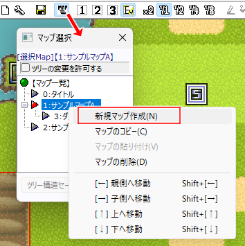 または、「マップ選択」ウィンドウ上で、子マップを作りたい位置を選択して「右クリック」し、「マップの新規作成」を選ぶことでも新規マップを作成できます。