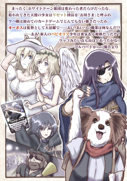 新たな旅団員、獣人の少年パピオリアが加入した『ホワイトドーン旅団』。 だが加入早々、リゼットらホワイトドーン旅団は想像以上に過酷な大規模ミッションに参加させられることに! 何とかその任務を終え、途中で天使の少女を拾ってクロスロードの街に無事帰還したリゼットたちは、長い休養期間――いわゆる『夏休み』を与えられることになる。 だがひさびさに帰ってきた街では、知らぬ間に不思議な出来事が起きるようになっていた。 『マイト&ドラゴンズ』というトレーディングカードゲームが引き金となって起きる様々な事件、依頼、そして陰謀。 ホワイトドーン旅団はこの夏休みの中で異変を究明すべく、あるいはそれぞれの欲求や好奇心に従って行動を開始する。 謎を抱えた新人のイヌ獣人パピオリア、リゼットらのことを母や父と呼ぶ天使の少女、そして眼帯の傭兵アルバート。 彼らを交えてなぜか「カードゲーム」と「アイドルプロデュース活動」にはげむことになる夏休みの中、最後に待ち受ける真実とは――!? ハードな展開あり、ほどほどのセクシー要素ありのサブカルチャー回! ![]() |